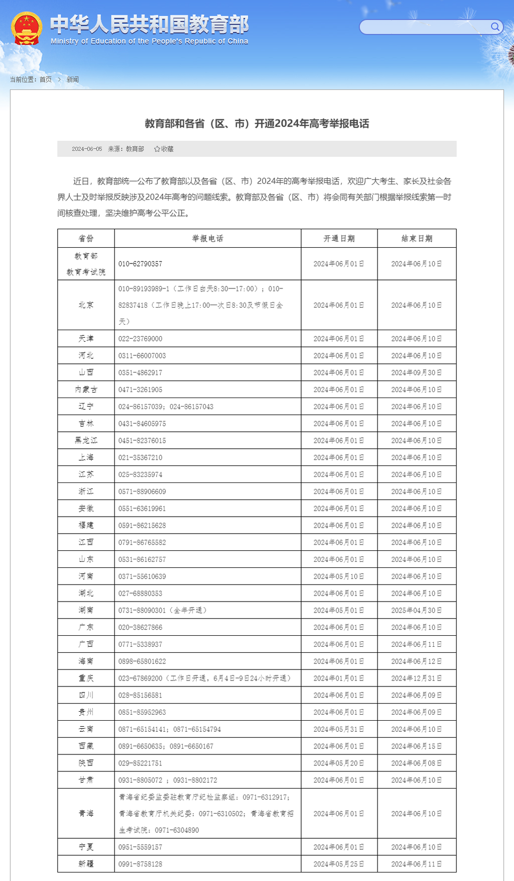 央视网消息:近日,教育部统一公布了教育部以及各省(区、市)2024年的高考举报电话,欢迎广大考生、家长及社会各界人士及时举报反映涉及2024年高考的问题线索。教育部及各省(区、市)将会同有关部门根据举报线索第一时间核查处理,坚决维护高考公平公正。
