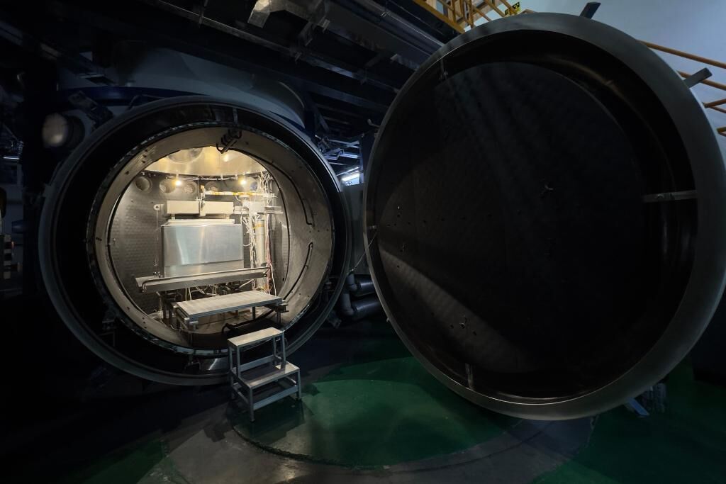 走进哈尔滨新区内的空间综合环境试验楼,随着圆形拱门缓缓打开,“月尘舱”映入眼帘,这便是月球表面环境模拟装置,主体是一个大约三层楼高的立式真空罐,内径达4米,一米见方的样品台闪着银光,悬置于顶部的探照灯和射线源造型各异。