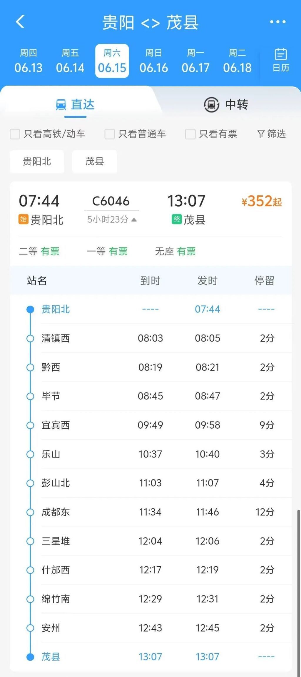 根据铁路12306APP显示