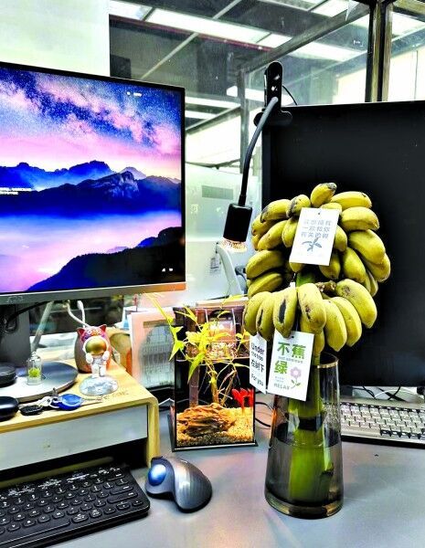 “现在大家工作都挺累的,职场里稍微有一点令人感到惊喜和有趣的话题,大家好像就会变得很开心。”吴圳是一名桌搭博主,自从他开始在办公桌上养香蕉之后,单位的很多同事都会好奇地走过来瞧瞧。