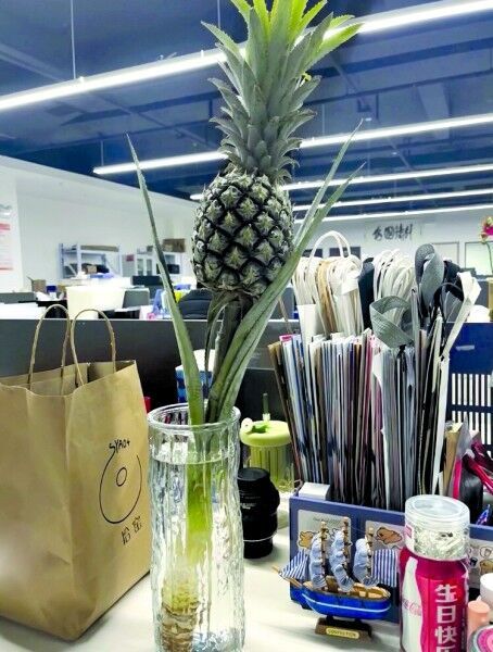 00后杨三日从事新媒体运营工作,她在工位上养了一个菠萝,“养菠萝是一件很酷的事情,不仅能观赏,还能吃,很配我特立独行的气质。”她说自从养了菠萝之后,每天上班时心情就变得非常好。“我的工位就像热带雨林一样,提前进入了春天。”