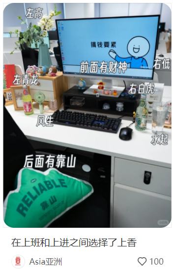 有网友分享工位的风水大有讲究:摆满绿植象征欣欣向荣,整体布置左高右低;后背有靠,面不对门;左靠窗,水杯放左边,寓意风生水起;杂物放桌面左边,右边越简约越好。