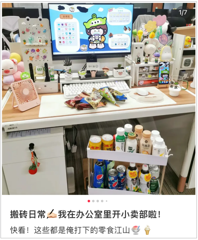 除此之外,还有人在工位养鱼、寄居蟹、水母、蟑螂等宠物;有人在工位开起了“小卖部”,吃的喝的样样俱全;有人环绕工位放上了靠垫、坐垫、抱枕、毛毯、沙发椅,保证随时可以躺、靠、卧,主打一个舒适。