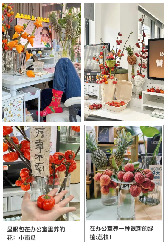摆上香蕉,寓意“禁止蕉虑”;放上草莓,寓意“莓有烦恼”;南瓜在桌,寓意“万事不南”;养上番茄,寓意“好运翻番”……