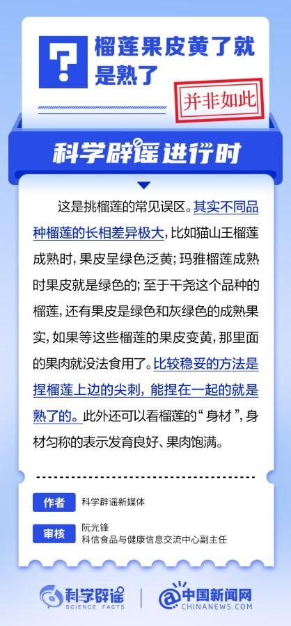 中新网6月6日电 榴莲果皮黄了就是熟了?这是挑榴莲的常见误区。不同品种榴莲的长相差异极大,比如猫山王榴莲成熟时,果皮呈绿色泛黄;玛雅榴莲成熟时果皮就是绿色的;至于干尧这个品种,还有果皮是绿色和灰绿色的成熟果实,如果等这些榴莲的果皮变黄,那里面的果肉就没法食用了。比较稳妥的方法是捏榴莲上边的尖刺,能捏在一起的就是熟了的。此外还可以看榴莲的“身材”,身材匀称的表示发育良好、果肉饱满。(来源:@科学辟谣 中国新闻网微博)