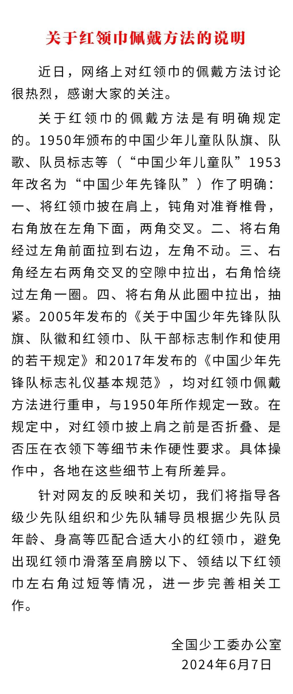中新网6月7日电 据全国少工委微信公众号消息,全国少工委办公室7日发布关于红领巾佩戴方法的说明。