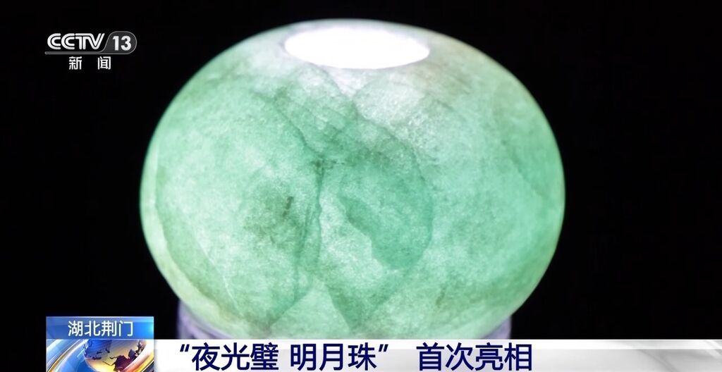 这里有许多珍贵的文物都是首次展出。这颗明月珠,是春秋早期的曾侯珠。在灯光的映衬下,依然能够还原当时碧绿通透的颜色,让我们感觉到是一种非常温润的玉器的材质。