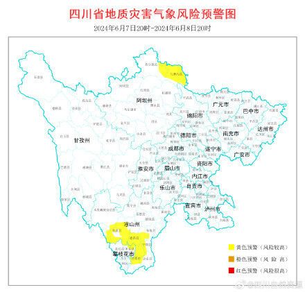根据四川省气象台天气预报情况,结合四川省地质环境条件,6月7日20时至6月8日20时,全省地质灾害气象风险预警结果如下: