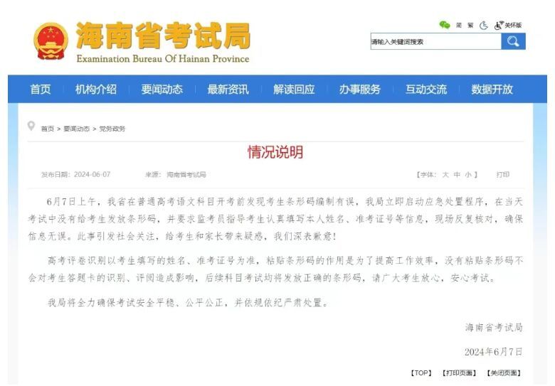 6月7日,海南省考试局发布情况说明: