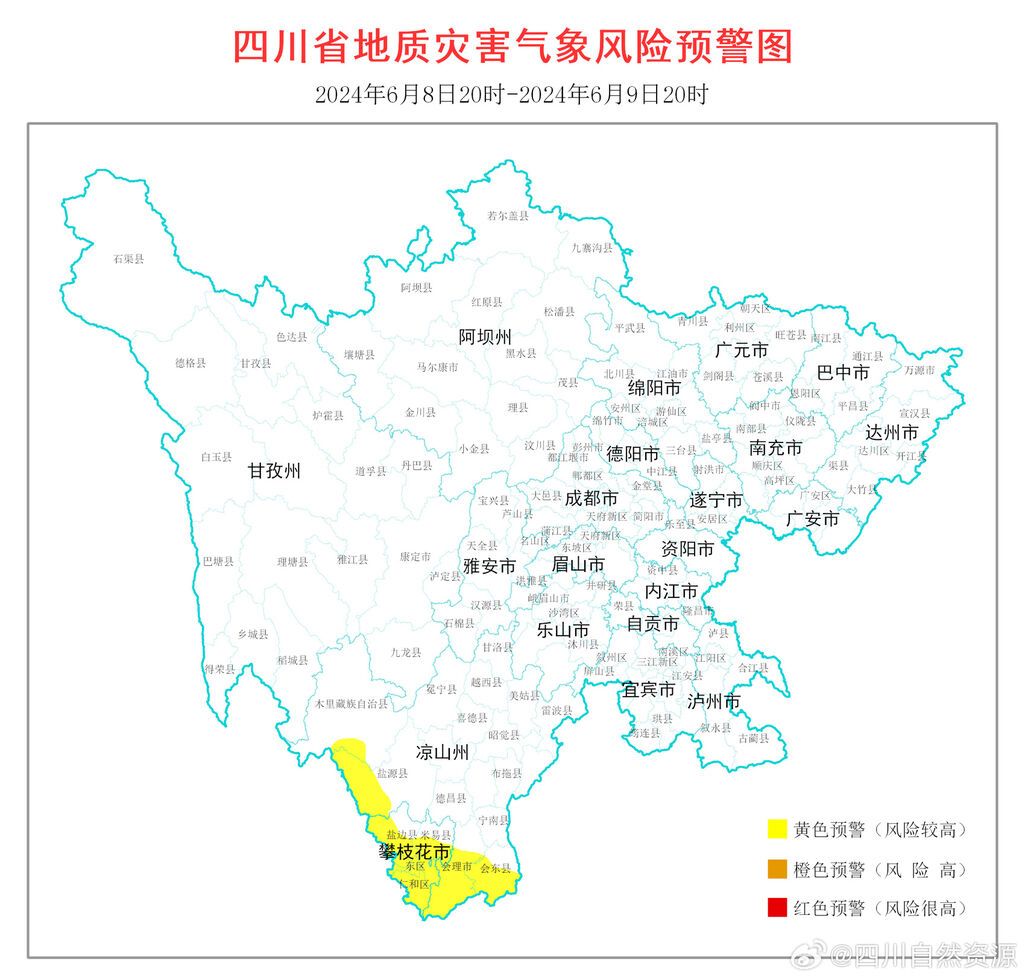 根据四川省气象台天气预报情况,结合四川省地质环境条件,6月8日20时至6月9日20时,全省地质灾害气象风险预警结果如下: