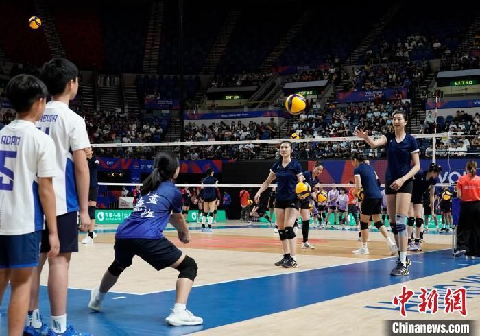 活动开始后,入场市民一同观看中国女排公开训练,球员们进行发球、接球和扣杀等练习,朱婷、袁心玥和李盈盈等主力球员大秀球技,让观众雀跃欢呼。