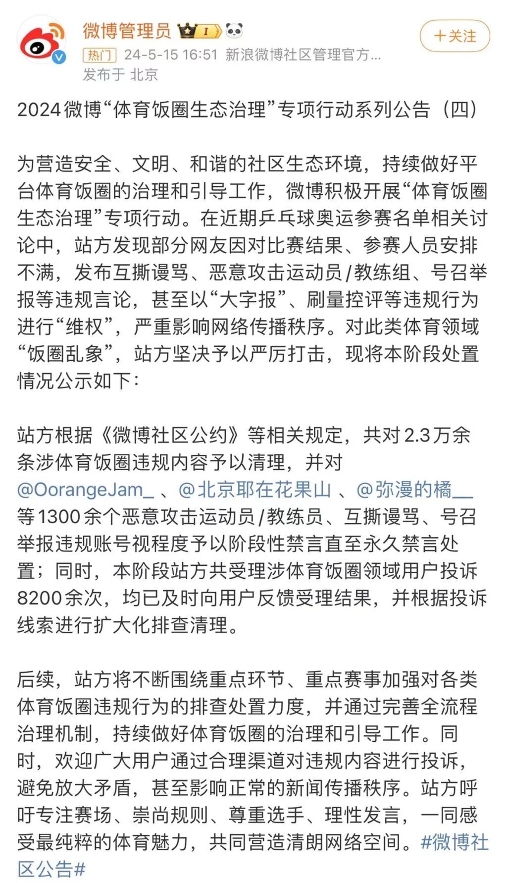 从4月23日起,多家互联网平台开展为期3个月的“体育饭圈生态治理”专项行动。5月15日,国家体育总局公开表态,坚决抵制畸形饭圈文化侵蚀体育领域。此前,中国奥委会曾连续发文,呼吁社会各界尊重运动员个人权益,理性追星,避免不当言行,坚决杜绝饭圈乱象向体育领域蔓延。
