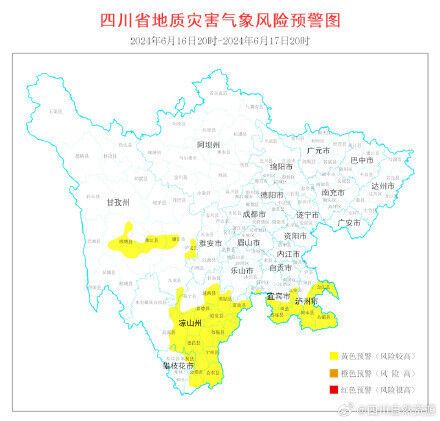 据@四川自然资源消息,根据四川省气象台天气预报情况,结合四川省地质环境条件,6月16日20时至6月17日20时,全省地质灾害气象风险预警结果如下: