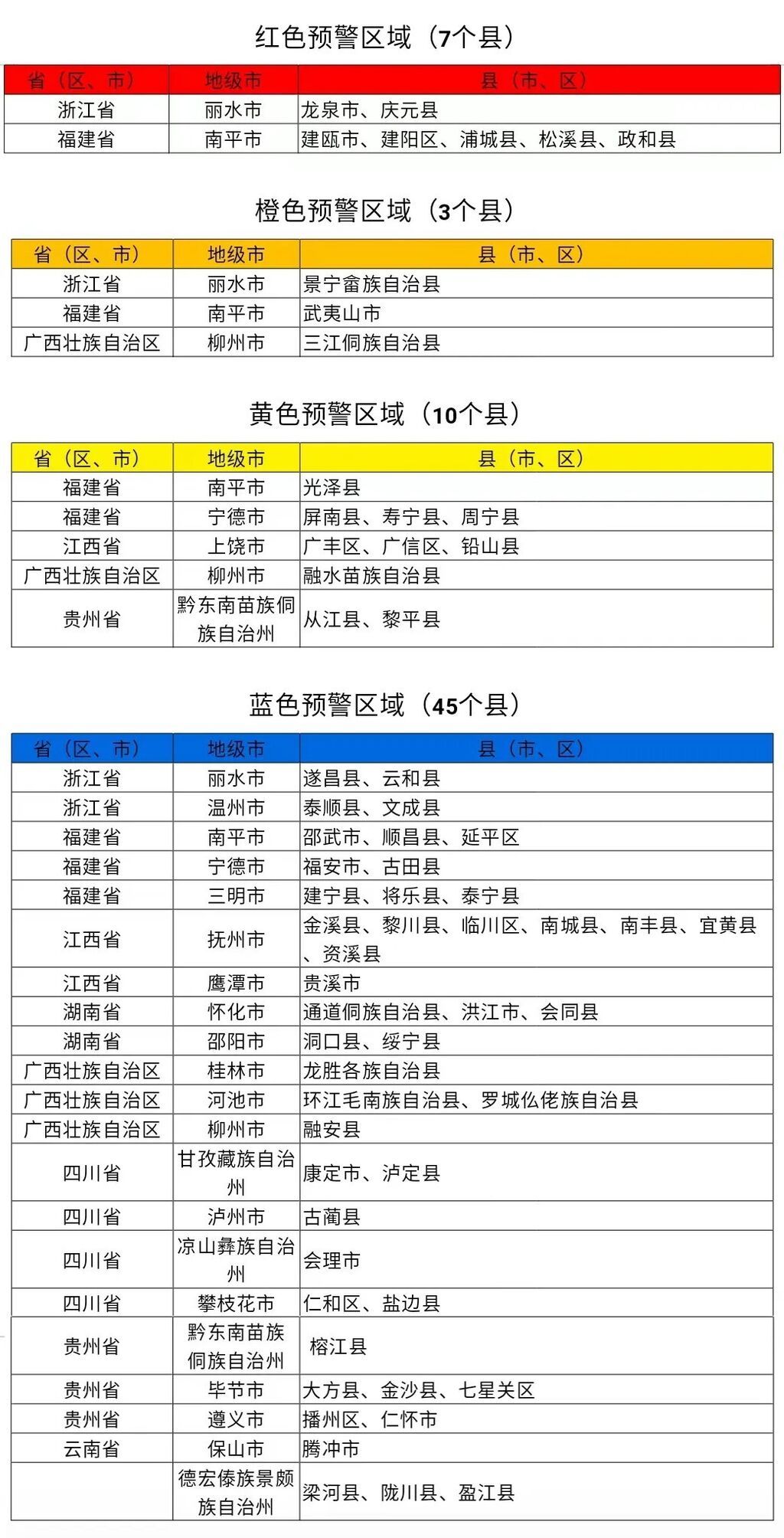 预计,6月16日20时至6月17日20时,浙江西南部、福建北部、广西北部等地部分地区发生山洪灾害可能性大(橙色预警),其中,浙江西南部、福建北部局地发生山洪灾害可能性很大(红色预警),预警区域涉及的县(市、区)见下表。其他地区也可能因局地短历时强降水引发山洪灾害,请各地注意做好实时监测、防汛预警和转移避险等防范工作。