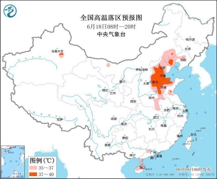预计6月18日白天,内蒙古东南部、辽宁中西部、河北、北京、天津、山东中西部、河南中东部、安徽北部、海南岛中北部等地有35~36℃高温天气,其中,辽宁西部、河北中南部、北京大部、天津大部、山东西北部和东南部等地部分地区最高气温37~39℃。