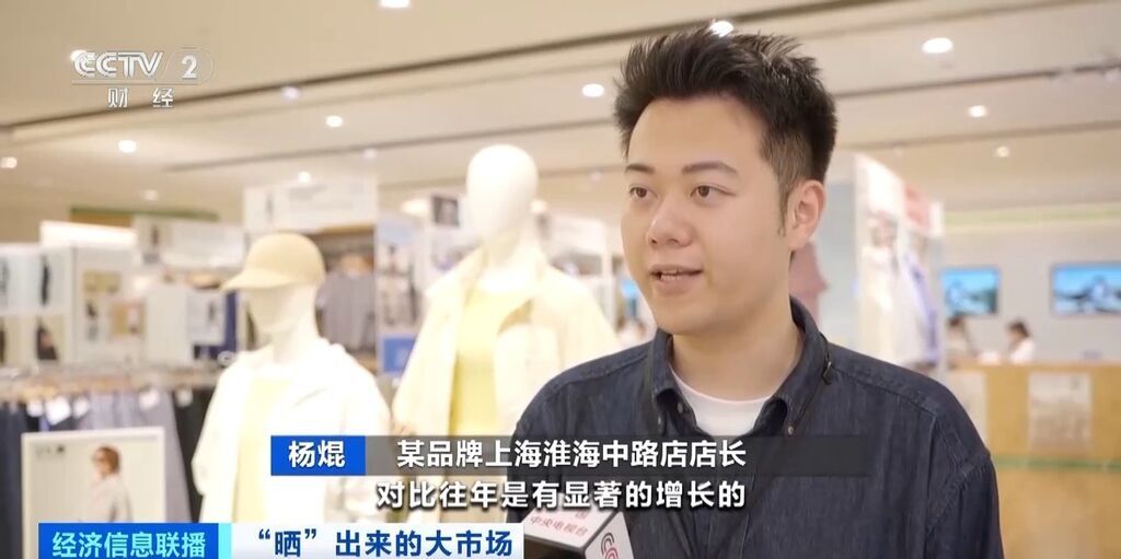 某品牌上海淮海中路店店长 杨焜:今年防晒衣整体销售对比往年有显著增长,防晒衣品类在全部的品类中,销售也是前五名。