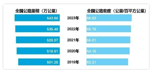 年末全国公路里程543.68万公里,比上年末增加8.20万公里。公路密度56.63公里/百平方公里,增加0.85公里/百平方公里。