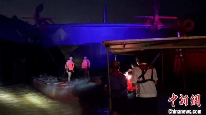经搜寻,当日约23时左右,救援人员在下游水域发现卡在两艘新造船舶船艏位置的失控附属机艇及2名遇险人员,成功将2人转移至“海巡10455”船,并将附属机艇拖带至安全水域。