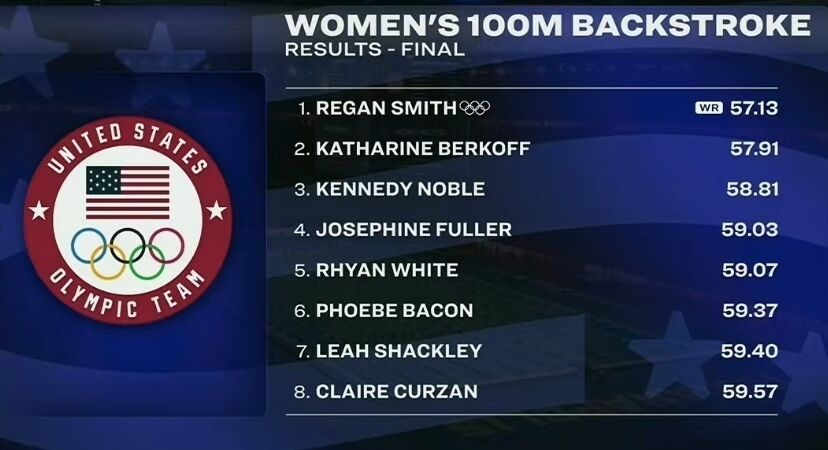 北京时间6月19日凌晨,美国游泳奥运选拔赛再破世界纪录,在女子100米仰泳决赛中,瑞根·史密斯以57秒13的成绩打破了该项目世界纪录。这一成绩比澳大利亚名将麦基翁保持的原有纪录提高了0.2秒。