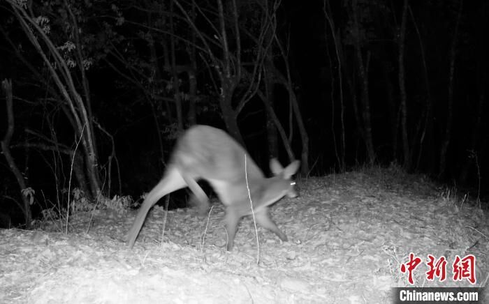 据介绍,这只动物活动在海拔近1800米的林间,后肢比前肢长,肩部低于臀部,喉部有两条明显的白色条纹,平行向下与胸部相连,两耳较大且尖,机警欢快地跳跃在林间,最后消失在林海。