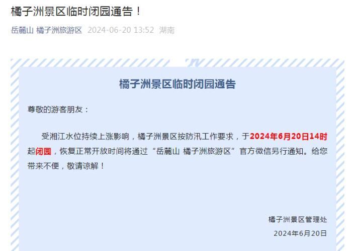 中新网6月20日电 据长沙市岳麓山风景名胜区管理局官方微信消息,受湘江水位持续上涨影响,橘子洲景区按防汛工作要求,于2024年6月20日14时起闭园,恢复正常开放时间将通过“岳麓山 橘子洲旅游区”官方微信另行通知。