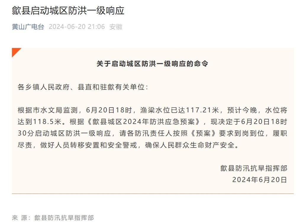 20日17时,歙县防汛抗旱指挥部启动城区防洪二级响应,并于1个半小时后又启动城区防洪二级响应。官方通报称,根据市水文局监测,6月20日18时,渔梁水位已达117.21米,预计今晚,水位将达到118.5米。
