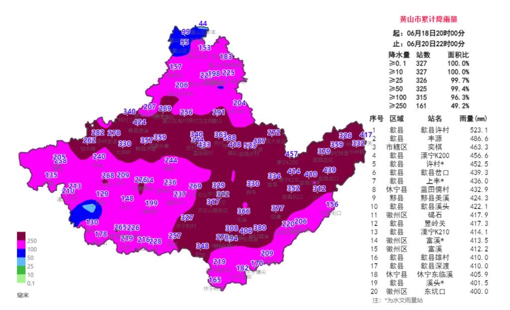 另据安徽省气象台消息,6月18日20时-20日22时,黄山市有降水,315个站降水量超过100毫米,161个站降水量超过250毫米,最大为歙县许村523.1毫米。