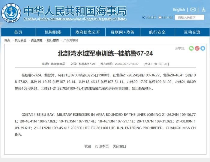中新网6月21日电 据中国海事局网站消息,北海海事局发布航行警告,6月21日7时至6月26日19时,北部湾部分海域进行军事训练,禁止船舶驶入。