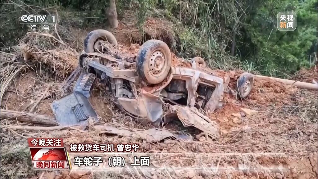 被救货车司机 曾忠华:泥水全部都冲到鼻子里,还不能呼吸,车内驾驶座凳子压在我的胸膛上,车轮子朝上面。