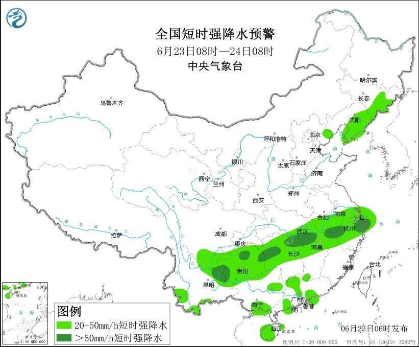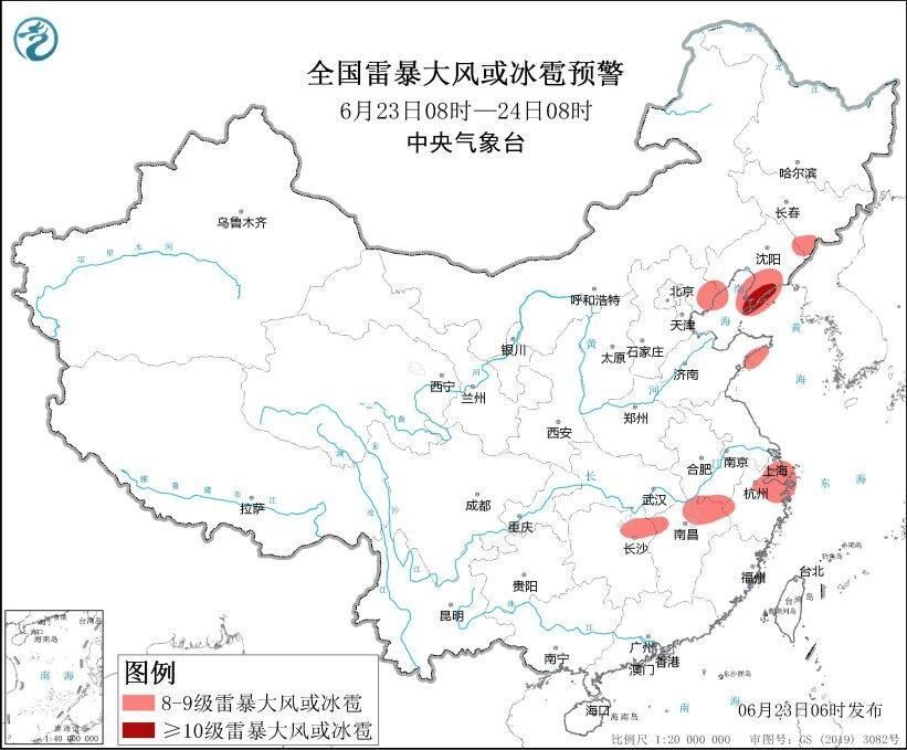 预计6月23日08时至24日08时,吉林东南部、辽宁东北部和南部、河北东北部、山东东部、安徽南部、上海、湖南东北部、江西北部、浙江北部等地的部分地区将有8级以上雷暴大风或冰雹天气,其中,辽宁南部的局地将有10级以上雷暴大风,最大风力可达11级以上;吉林东部、辽宁东部和南部、河北东北部、安徽中南部、江苏南部、上海、湖北东部和南部、湖南、江西中北部、浙江中北部、四川南部、贵州、云南东北部和南部、广西南部和东北部、广东中西部、海南岛等地的部分地区将有小时雨量大于20毫米的短时强降水天气,其中,安徽南部、湖北东南部、湖南北部、江西北部、浙江中部、贵州西部和东北部、云南东北部等地的局地小时雨量大于50毫米,最大可达80毫米以上。