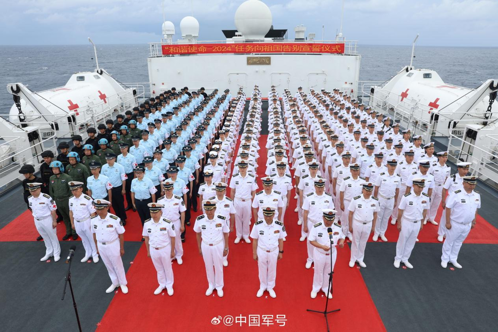 6月23日上午,执行“和谐使命-2024”任务的和平方舟医院船,在驶离中国传统海疆线之际,举行宣誓和签名仪式,激励全体任务官兵守护和平、传播友谊、为国争光。