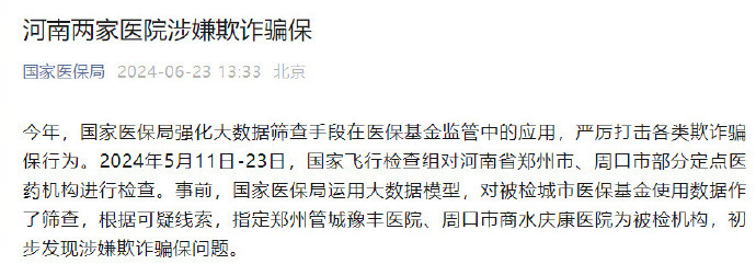 ·国家医保局:河南两家医院涉嫌欺诈骗保,违规使用的医保基金已追回。