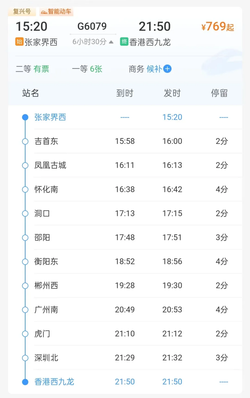 每天8时30分,G6080次列车从香港西九龙站始发,于14时52分抵达张家界西站;15时20分,G6079次列车从张家界西站始发,21时50分抵达香港西九龙站。