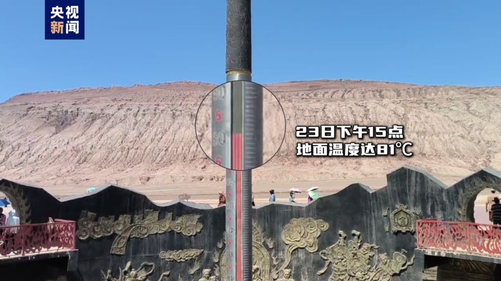 6月23日15点左右,新疆吐鲁番市火焰山景区内巨型“金箍棒”温度计显示这一区域地表温度达到81℃。尽管天气炎热,但仍有来自全国各地的游客“逐热而来”。