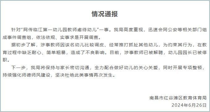 央视网消息:据“红谷滩区教育体育局发布”微信公众号消息,南昌市红谷滩区教育体育局就“临江第一幼儿园教师虐待幼儿”一事发布通报。