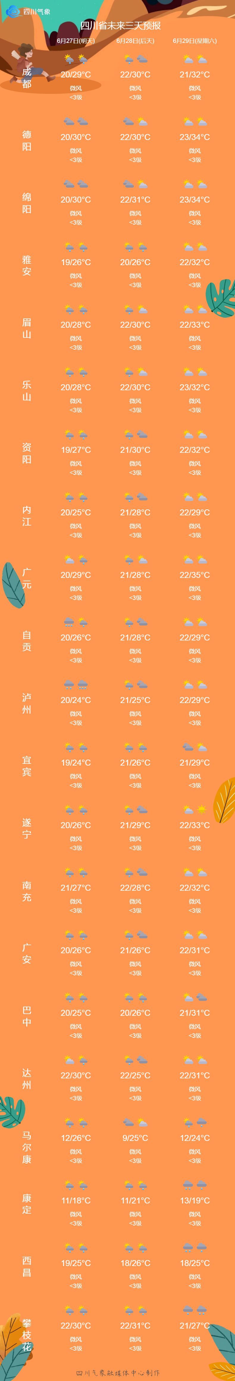 对于盆地地区,四川省气象台预计,27日至28日,盆地大部阴天间多云,部分地方有阵雨或雷雨,西南部、东北部有中雨,局部大雨到暴雨。