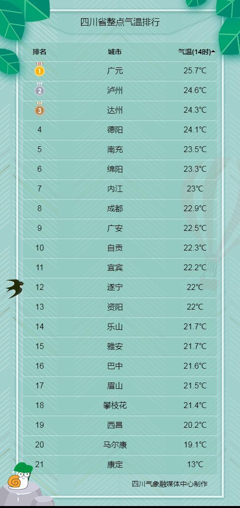 今天,整个四川都沉浸在盛夏时节难得的凉快天气中。据四川省气象台观测,6月26日14时,全省各城市的实况气温大多在20~25℃之间。