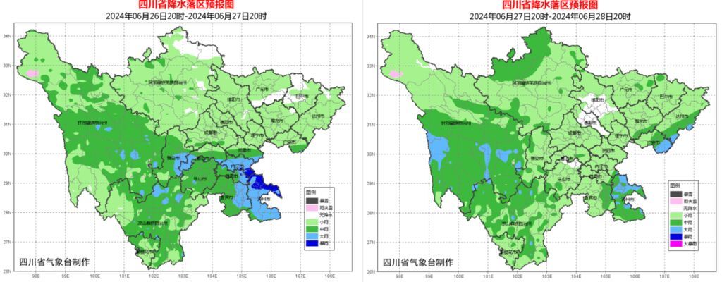 其中:今天(6月26日)晚上到明天白天,雅安、眉山、乐山、内江、自贡、宜宾、泸州7市和资阳、广安2市南部有中雨,局部大雨到暴雨。明天晚上到28日白天,达州、广安、泸州3市和宜宾市东部有中雨,局部大雨。相关地区灾害隐患点需做好巡查排险和应急避险准备工作。