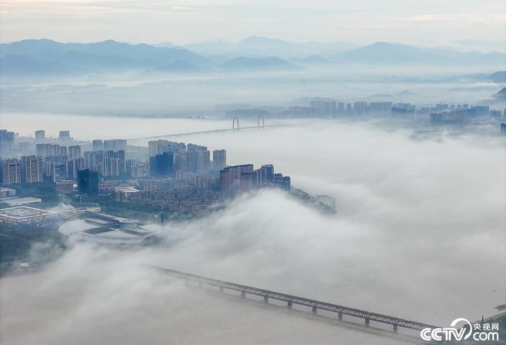 杭州:钱塘江雾气弥漫,城区高楼宛若天空之城。
