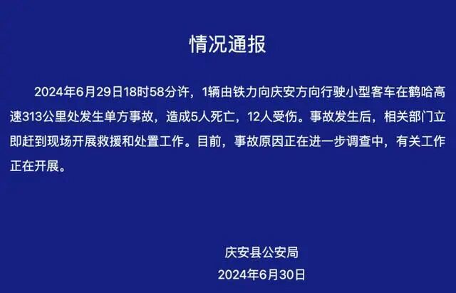 2024年6月29日18时58分许,1辆由铁力向庆安方向行驶小型客车在鹤哈高速313公里处发生单方事故,造成5人死亡,12人受伤。事故发生后,相关部门立即赶到现场开展救援和处置工作。目前,事故原因正在进一步调查中,有关工作正在开展。