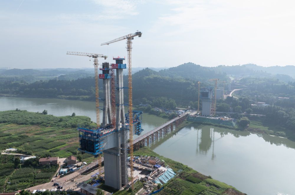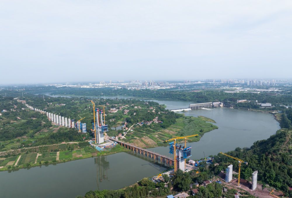 资阳沱江特大桥位于四川省资阳市雁江区,为主桥622米、设计时速350公里的矮塔斜拉桥。记者在现场看到,本次封顶的10号主塔高114.5米,施工难度较大。