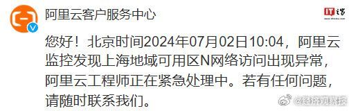 据阿里云客户服务中心反馈,北京时间 2024 年 07 月 02 日 10:04,阿里云监控发现上海地域可用区 N 网络访问出现异常,阿里云工程师正在紧急处理中。
