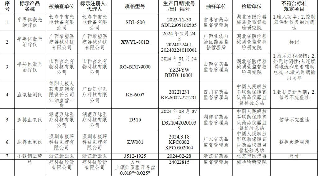 国家药监局网站今天(7月2日)发布通告,通告称,为加强医疗器械监督管理,保障医疗器械产品质量安全有效,国家药品监督管理局组织对半导体激光治疗机、医用脉搏血氧仪、正畸丝3个品种进行了产品质量监督抽检,有7批(台)产品不符合标准规定。具体情况通告如下: