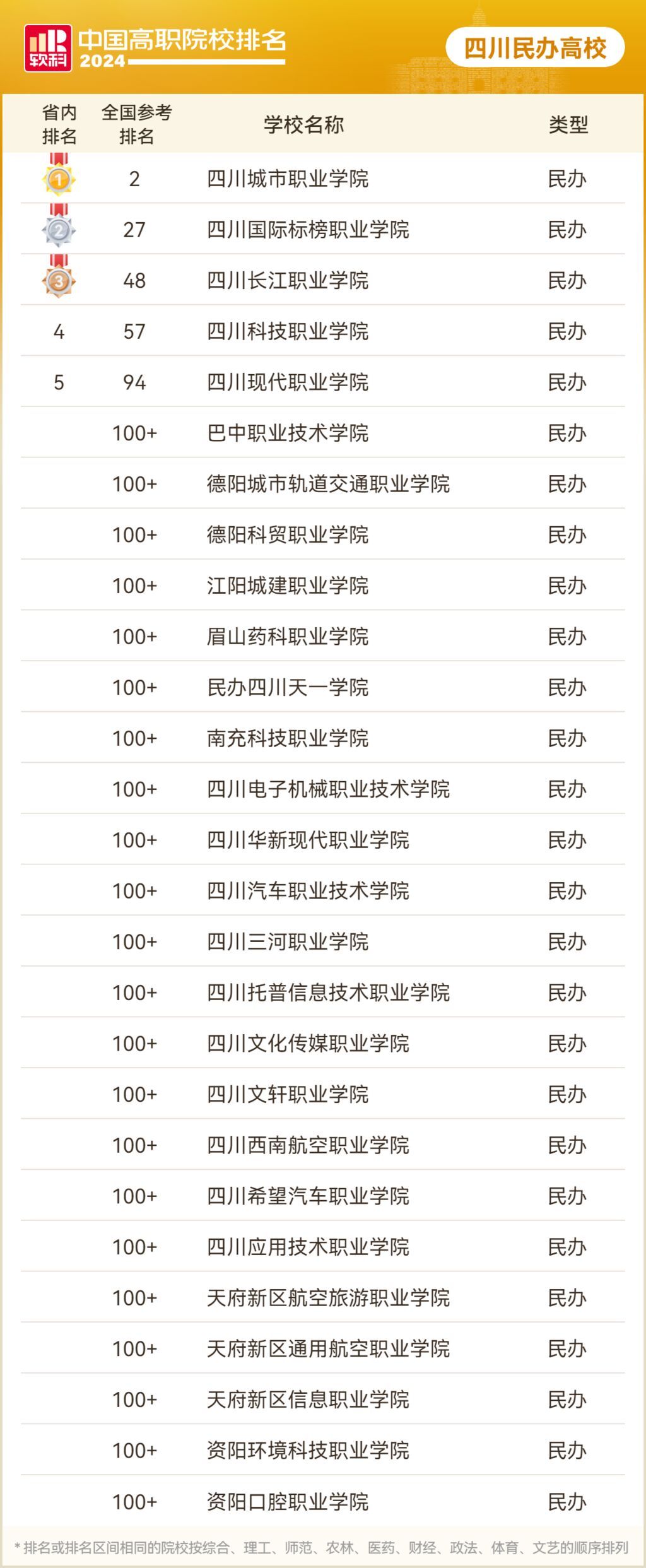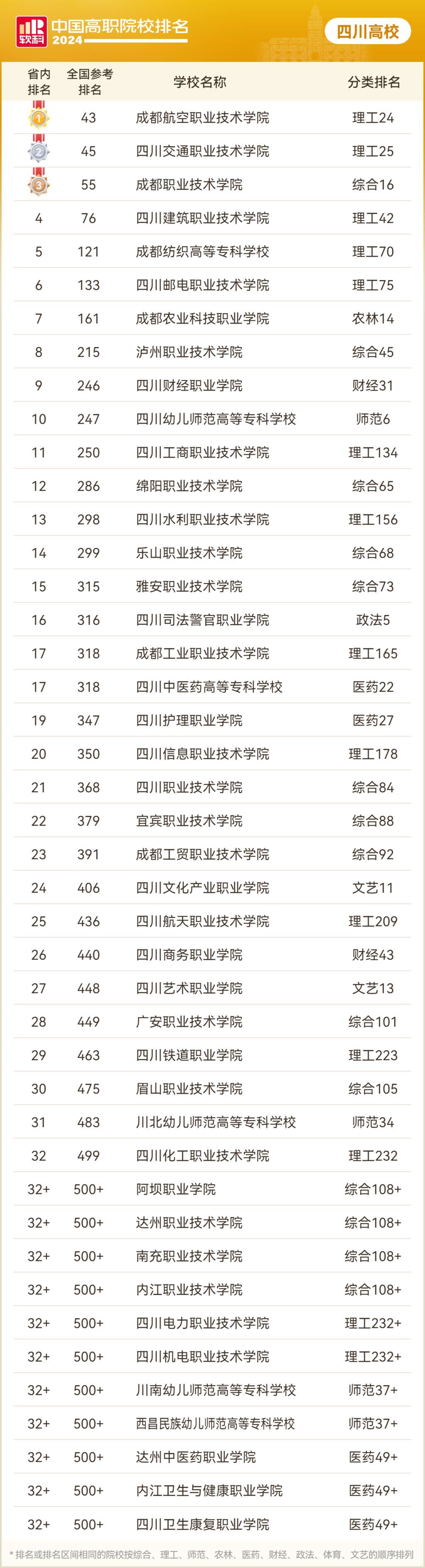 7月3日,高等教育专业评价机构软科发布“2024软科中国高职院校排名”。四川省今年共有70所高职院校上榜,其中公办高职院校上榜43所。