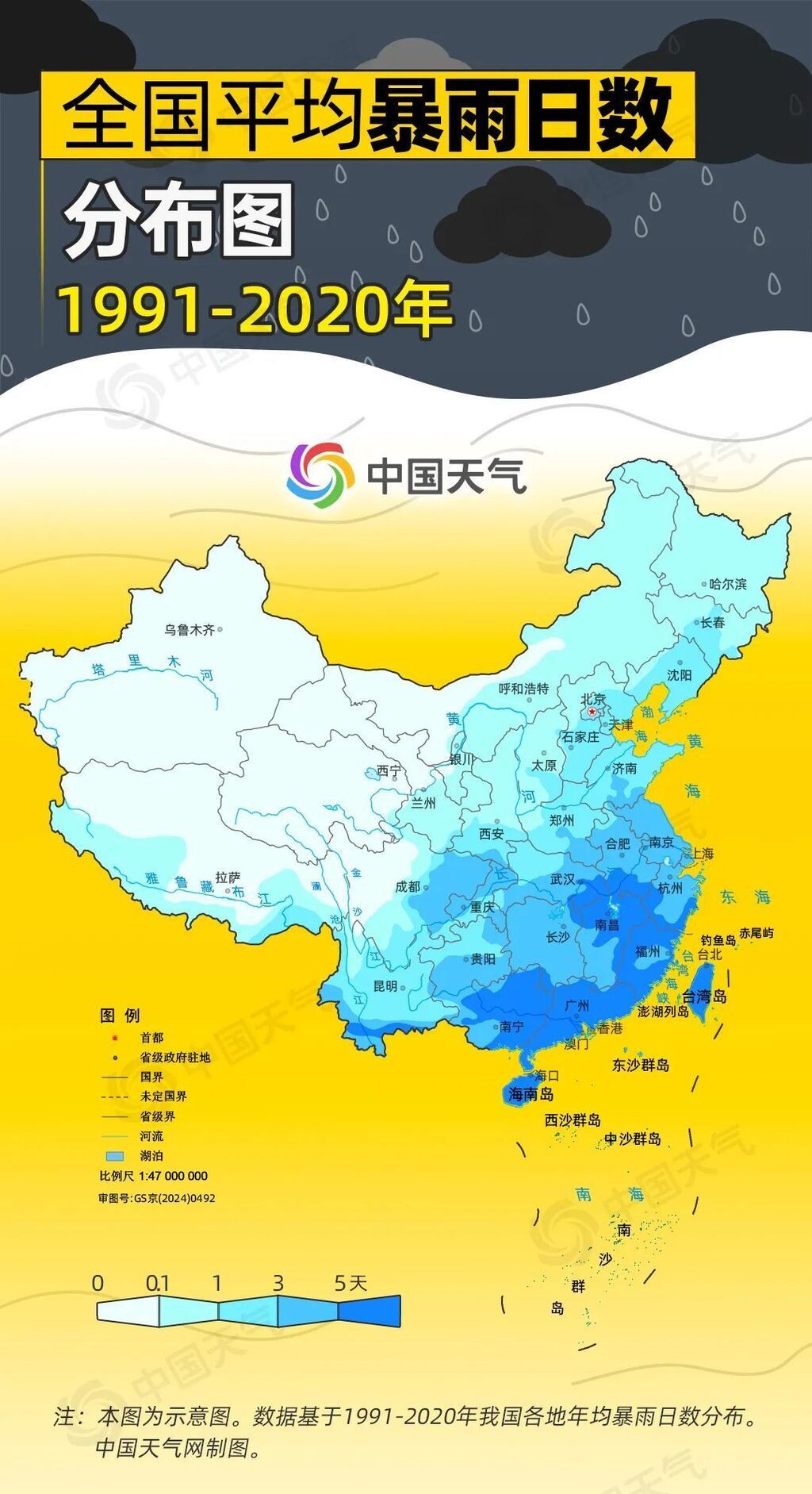 相较而言,北方多地的暴雨日数明显少一些,京津冀、河南、山东、辽宁以及陕西南部、吉林中部一带在1至3天,其他大部地区年均暴雨日数不足1天。