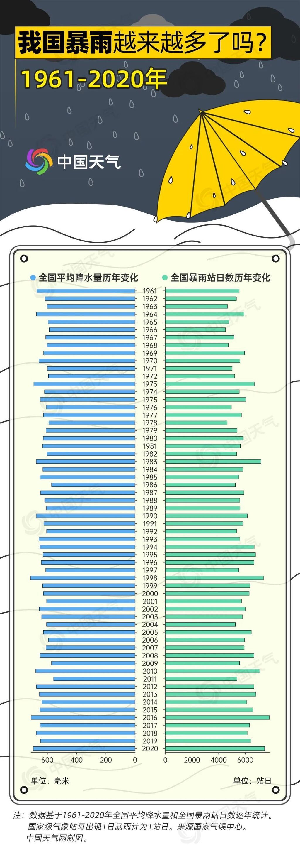 “桂林暴雨变威尼斯”、“长沙暴雨1小时下了54个西湖”、“杭州灵隐寺发大水”……今年6月进入主汛期以来,南方地区的暴雨过程一轮接一轮,多地降水量突破历史同期极值,暴雨相关话题频登热搜。今年南方强降雨有多猛?暴雨如此频繁是否罕见?影响我国的暴雨是否越来越多?中国天气网盘点气象大数据,揭秘我国暴雨60年之变。