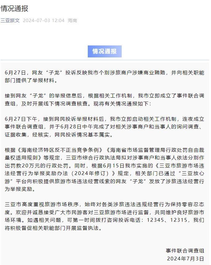 ·三亚通报“涉旅商户涉嫌商业贿赂”:情况属实,涉事商户被罚20万元。