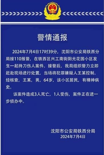 ·沈阳一小区发生持刀伤人案致3死1伤,嫌疑人有精神病史。