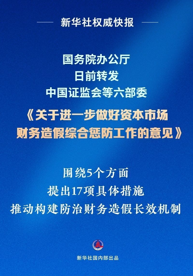国务院办公厅日前转发中国证监会、公安部、财政部、中国人民银行、金融监管总局、国务院国资委《关于进一步做好资本市场财务造假综合惩防工作的意见》。