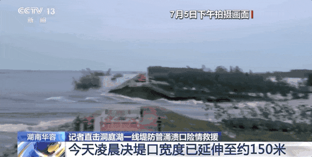 今天凌晨,总台记者在现场看到有武警、消防、民兵等救援力量和很多大型设备车辆。记者了解到,5日晚,决堤口已延伸至约100米,今天凌晨,决堤口已经延伸至约150米。